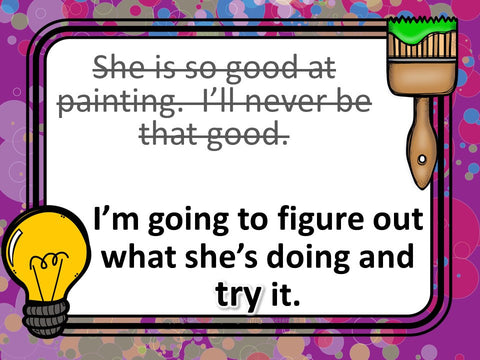 Looking for a way to encourage growth mindset in your art room? This bulletin board is a perfect reminder for students to change their mindsets and improve their attitudes. Included in this download are 10 negative statements that you may hear students say. These comments have a line through them (but are still easy to read) and a more positive statement to replace it below.