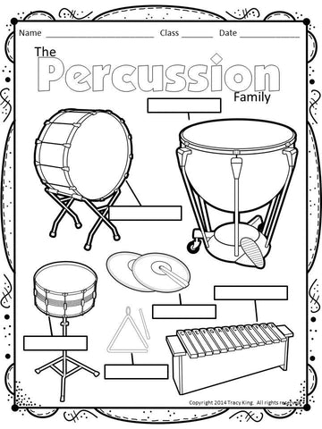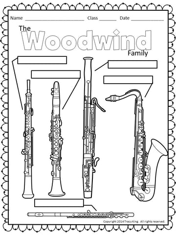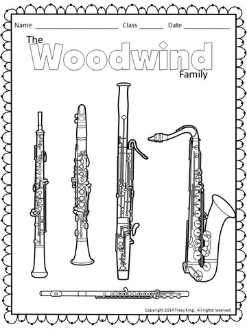 This set of instrument coloring sheets is quite versatile. Each of the four standard instrument families are represented in this way: