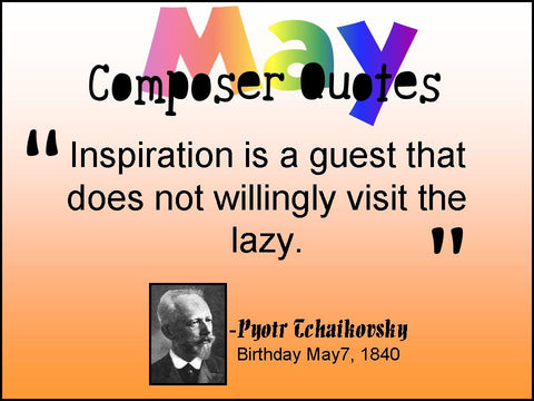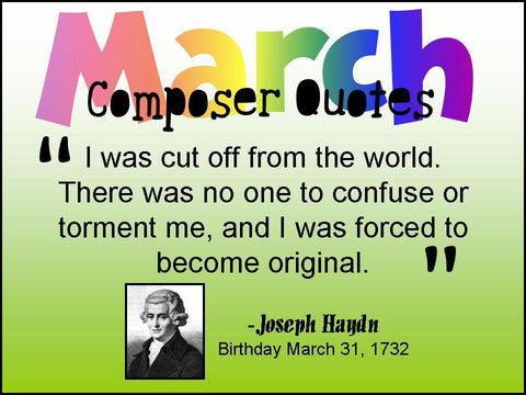 This kit contains quotes from 12 famous composers. There are two versions of each quote sheet included. Each version contains the quote, composer name, birthday and a small picture of the composer. One set contains a month name that matches the birth month of the composer featured. This set would work great if you choose a composer of the month. The second version does not contain the name of the month so that you can use it in a variety of ways.