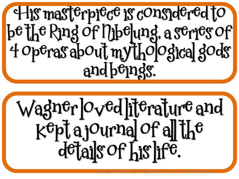 In addition to the display, this kit features 2 worksheets designed for 3rd-6th. One worksheet asks students to create a song list for events and the other uses a quote by Wagner as a writing prompt. These could be extended into junior high. The bulletin board is appropriate for junior high and high school as well as elementary classes.