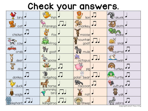 Included in this download are 44 animal rhythm cards, an instruction sheet for posting at a workstation and a chart with all of the answers that students can use for self-checking. Rhythms include quarter note, barred eighth notes and quarter rest. Add clothespins and you are ready for an engaging learning station!