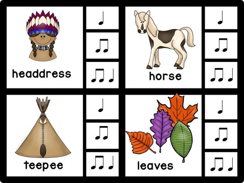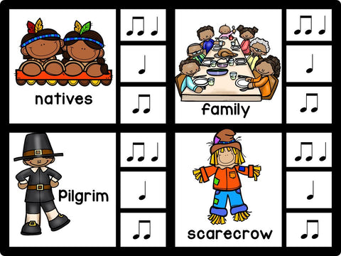 Clip to it! In this clothespin activity students are asked to clip the rhythm that matches the syllables in each Thanksgiving themed picture. A combination of pictures from the first Thanksgiving and more modern celebrations are included. This activity works great in centers or small groups. Before placing them in a workstation, you should plan a little bit of time to print the cards on cardstock, cut and laminate them for maximum durability.