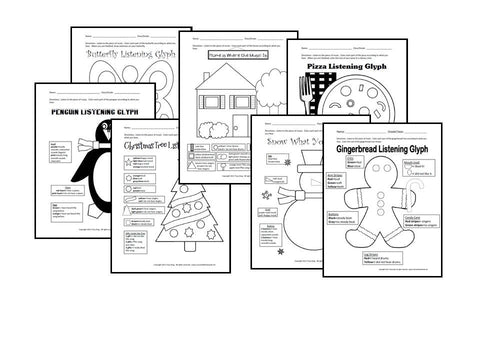Included in the kit are 7 glyphs: butterfly, penguin, house, Christmas tree, snowman, pizza and gingerbread man. Also included are suggestions for using the glyphs and a few ideas for listening examples.