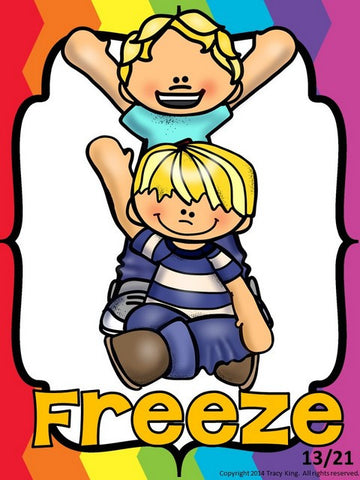 In this activity students dance to the music that you choose (some suggestions are included) and freeze in a pose on one of the freeze cards. In this edition the cards show students dancing and freezing in partners or small groups. You can make this an elimination game by having students that wiggle after the Freeze card is shown sit out.