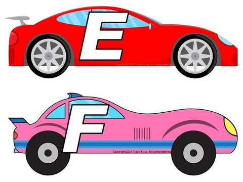 This display features cars for each line and space on the treble clef. Tires/wheels with letter names are also included if you would like to mix them up and do cars on the lines and tires in the spaces or vice versa.