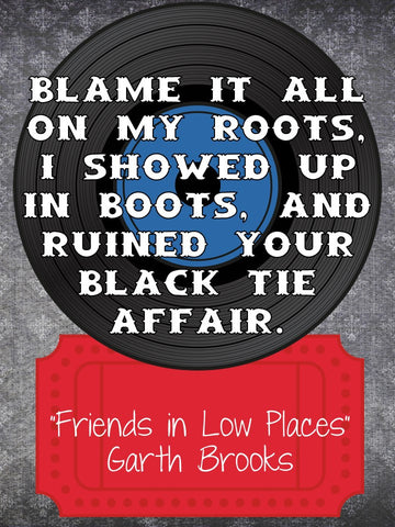 Blame it all on my roots, I showed up in boots, and ruined your black tie affair. “Friends in Low Places” Garth Brooks