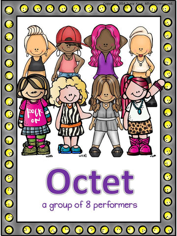 This kit contains 8 colorful visual definitions of ensemble groupings using a rock star theme. Each one contains a grouping word like "solo", "trio" or "octet" with a coordinating number of musicians in each. This kit would be a great resource to leave up all year.