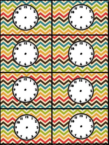 In addition to the 55 pre-made cards, there are 4 sheets of blank clocks in colors that match the schedule cards. Print these, draw the time on with a black marker and laminate to display.