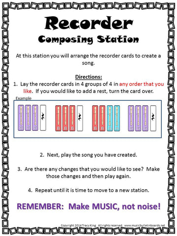Also included in this kit is a sheet for you to print and laminate and place at your workstation. It contains directions for students to follow while working at this center. Two sheets to record compositions are included. One with the treble clef staff and one without.
