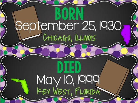 This download includes a colorful bulletin board, 4 book review sheets and a coloring sheet to celebrate Shel Silverstein. This is a great addition to an author study in your classroom!