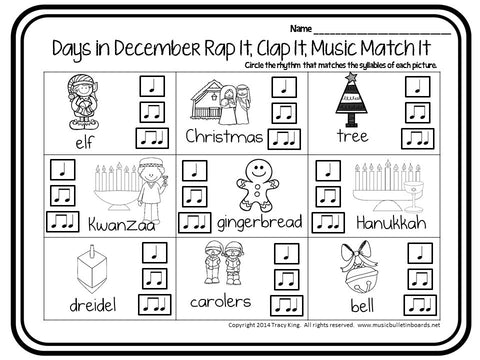 Rap it, Clap it, Music Match it is an activity that challenges students to say the name of the picture on 12 thematic cards, clap it to discover the number of syllables it has and then match it to notes that represent those syllables. Notes included are quarter note and barred eighth notes.