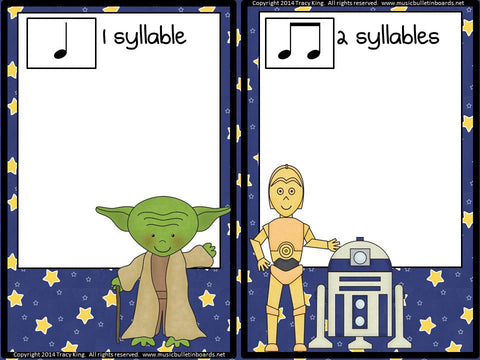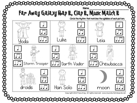 Rap it, Clap it, Music Match it is an activity that challenges students to say the name of the picture on 12 thematic cards, clap it to discover the number of syllables it has and then match it to notes that represent those syllables. Notes included are quarter note and barred eighth notes.