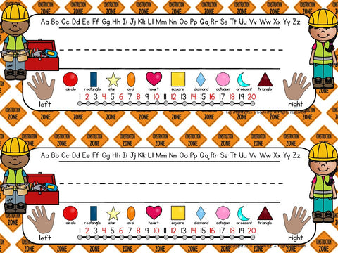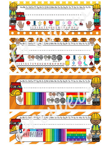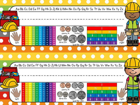 Caution: Kids at Work using these construction themed name plates as a reference! Use them on student desks, tables or portfolios. They feature a construction theme with a tool box and construction workers. There are four designs for you to choose from with varying elements.
