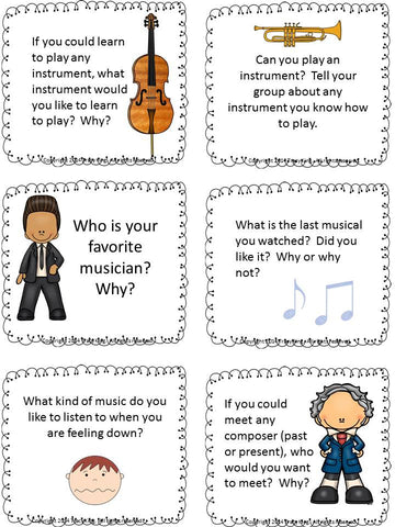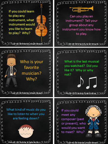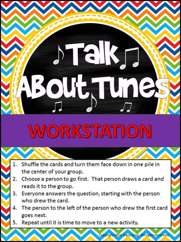 Like most teachers I realized that my students loved to talk during workstation time, so...I let them! This kit includes 30 discussion starters like "Who is your favorite musician? Why?" and "What do you learn in music class that help you in other classes?"