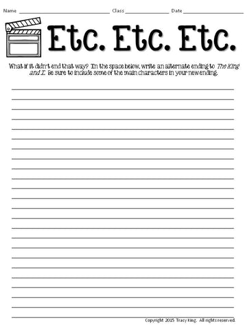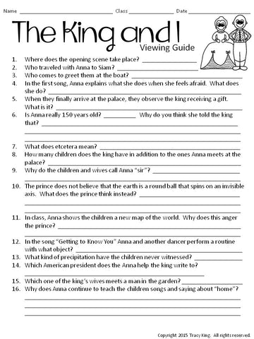 PLEASE NOTE: The viewing guide was created to go along with the 1956 movie version of this musical. The viewing guide was designed to be used while watching the movie. All of the other sheets could work after viewing any other recordings or performances of The King and I.