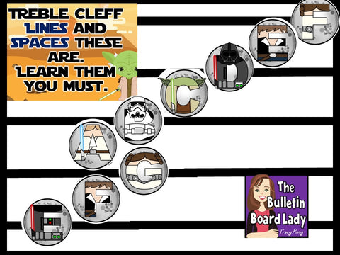 Looking for an attention getting display to reinforce the names of the lines and spaces of the treble clef staff? This space themed bulletin board is it! Included in this download is a label for each line and space on the treble staff and a title sheet with a colorful and unique look inspired by Star Wars characters.